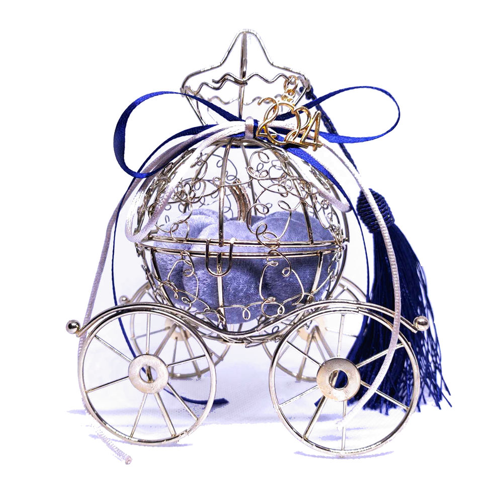 Επιτραπέζιο Χειροποίητο Γούρι 2025 Μεταλλική Χρυσή Άμαξα με Γκρι Κολοκύθα και Φούντα - Γκρι Μπλε Χρυσό ποσότητα