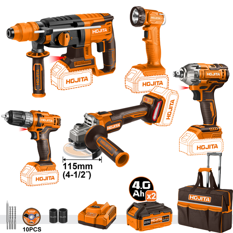 Σετ Εργαλείων Μπαταρίας Hojita 20V (5 τεμ.) Το σετ εργαλείων μπαταρίας Hojita 20V περιλαμβάνει όλα όσα χρειάζεστε για απαιτητικές επαγγελματικές ή DIY εργασίες. Με ισχυρές μπαταρίες 20V και κινητήρες χωρίς ψήκτρες, αυτό το σετ προσφέρει μέγιστη απόδοση και ευελιξία. Μπουλονόκλειδο 300Nm: Με ροπή 300Nm, υποδοχή 1/2′ και τρεις ρυθμίσεις στροφών (0-1300/0-2100 rpm), είναι ιδανικό για σφιξίματα υψηλής πίεσης. Δραπανοκατσάβιδο: Παρέχει μέγιστη ροπή 45Nm και δύο ταχύτητες (0-400/0-1500 rpm) για ακριβείς εφαρμογές βιδώματος και τρυπήματος. Περιστροφικό Κρουστικό Πιστολέτο: Ισχύς 2.0J και μέγιστη διάτρηση 26mm σε τσιμέντο, με σύστημα τσοκ SDS Plus για εύκολη αλλαγή εργαλείων. Γωνιακός Τροχός: Τρεις ταχύτητες (3000/6000/9000 rpm) και δίσκος 115mm για κοπές ακριβείας. Φακός Εργασίας: LED ισχύος 1.5W με φωτεινότητα 150 lumens για φωτισμό σε σκοτεινές περιοχές εργασίας. Το σετ περιλαμβάνει δύο μπαταρίες 4.0Ah, φορτιστή, μύτες, καρυδάκια, τρυπάνια και καλέμι, όλα σε πρακτική υφασμάτινη τσάντα για εύκολη μεταφορά