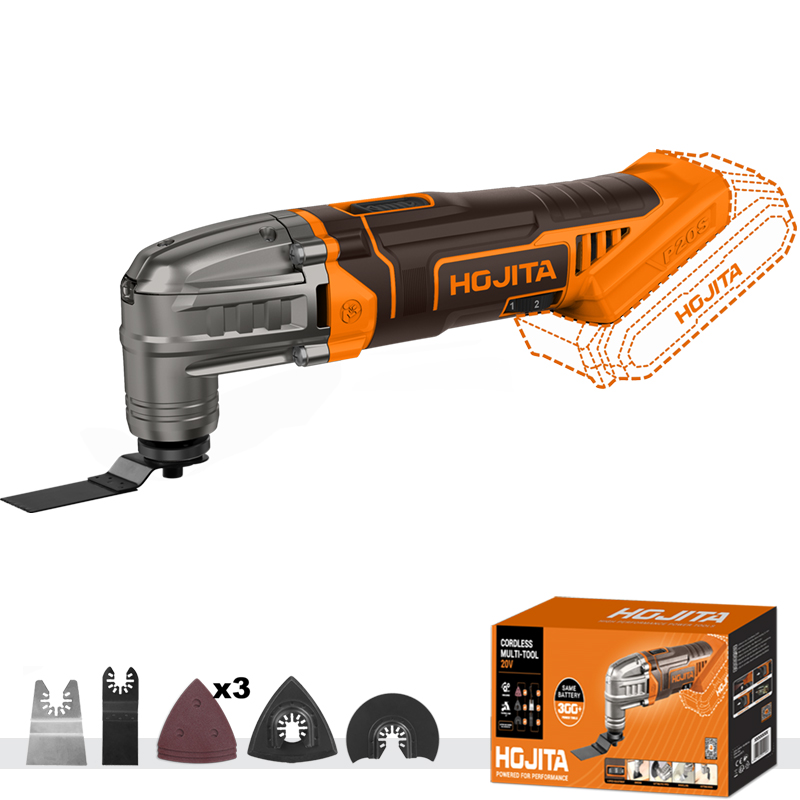 **Παλμικό Πολυεργαλείο Hojita Μπαταρίας 20V** Το παλμικό πολυεργαλείο Hojita 20V είναι ιδανικό για διάφορες εργασίες κοπής, λείανσης και αφαίρεσης υλικών, προσφέροντας ευελιξία και ακρίβεια. Με **στροφές χωρίς φορτίο** από 5000 έως 20000rpm και **γωνία ταλάντωσης 3.2°**, παρέχει δυνατότητα προσαρμογής με τις **6 ρυθμίσεις ταχύτητας**, εξασφαλίζοντας υψηλή απόδοση για κάθε είδους εργασία. **Περιλαμβάνει**: – 1 εύκαμπτη ξύστρα – 1 λάμα κοπής – 1 λάμα κοπής μπετού – 1 κλειδί ΑΛΛΕΝ – 1 βάση λείανσης – 3 γυαλόχαρτα Με **βάρος μόλις 0.85Kg**, είναι εύκολο στη χρήση και μεταφορά. **Η μπαταρία δεν συμπεριλαμβάνεται.**