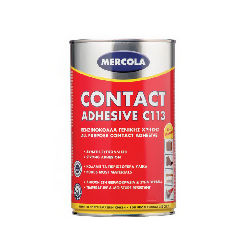Η CONTACT C113 είναι ισχυρή βενζινόκολλα γενικής χρήσης με βάση το συνθετικό καουτσούκ, συνθετικές ρητίνες και διαλύτες. Έχει εξαιρετική αντοχή στη θερμοκρασία, στην υγρασία, στα έλαια και στα οξέα.