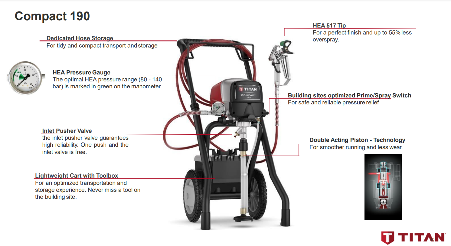 Το σύστημα βαφής Titan Compact 190 όχι μόνο είναι εύκολο στη χρήση, αλλά επιτρέπει στους χρήστες για πρώτη φορά να επιτύχουν τέλεια αποτελέσματα. Σας επιτρέπει να δουλεύετε με όλα τα χρώματα, ακρυλικά χρώματα τοίχου, λατέξ χρώματα τοίχου, γαλακτώματα τοίχου, ακρυλικά σμάλτα, εμποτισμοί ξύλου, λεκέδες βερνικιών, λάδια ξύλου, χρώματα επεξεργασίας σκουριάς, μεταλλικές βαφές.