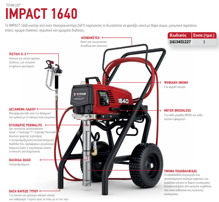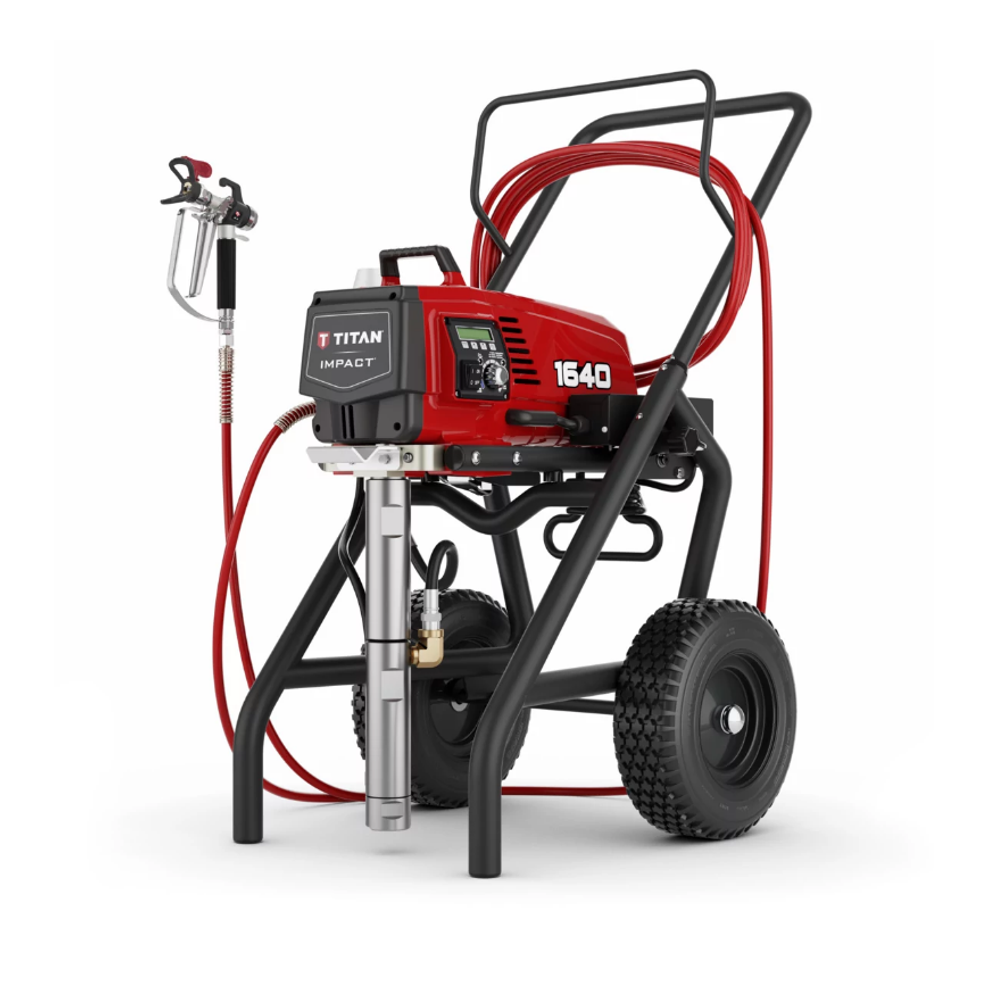 Το Titan Impact 1640 είναι ένα επαγγελματικό airless μηχάνημα βαφής υψηλής απόδοσης, σχεδιασμένο για απαιτητικές και συνεχόμενες εργασίες σε μεγάλες επιφάνειες. Κατάλληλο για ψεκασμό πλαστικών χρωμάτων, ασταριών, βερνικιών, εποξικών, ακρυλικών, πυράντοχων επιστρώσεων, high-build υλικών, ψεκαστού στόκου, level 5 finishes, knockdown texture, παχύρρευστων και λειαντικών υλικών.