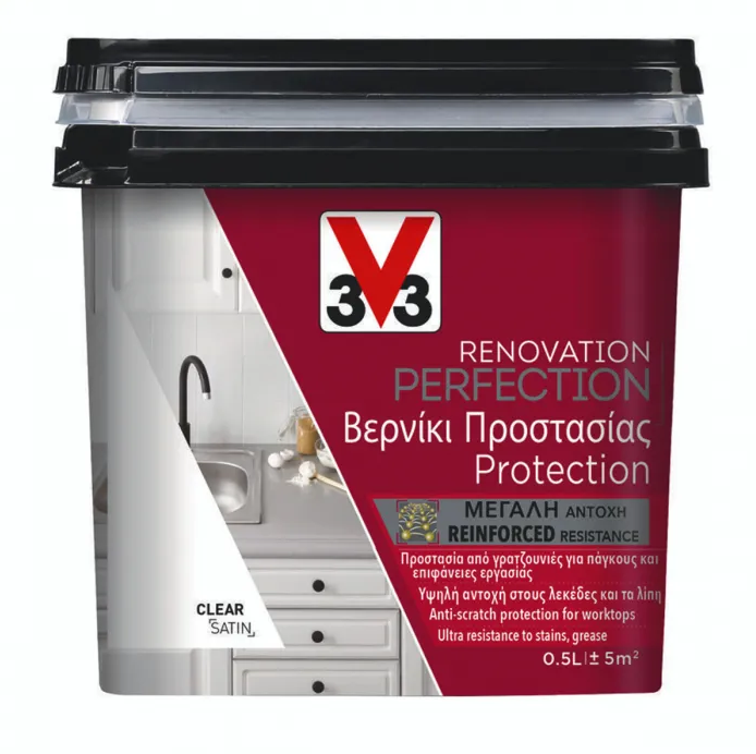 Το βερνίκι νερού RENOVATION PERFECTION® έχει ειδικά σχεδιαστεί για πρόσθετη προστασία οριζόντιων επιφανειών με συνεχή χρήση και μεγάλη καταπόνηση. Χάρη στα ειδικά πολυμερή και τους ενεργοποιητές που περιέχει, προστατεύει τα χρώματα Renovation Perfection στους πάγκους εργασίας από χτυπήματα και γρατζουνιές.Το Βερνίκι Προστασίας RENOVATION PERFECTION® δημιουργεί ένα φιλμ προστασίας πάνω στους πάγκους εργασίας που δρα σαν ασπίδα ενάντια στη φθορά της καθημερινής χρήσης.
